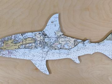 23" x 10" Great White Shark shape with Cape Cod, MA chart. These are ready to hang as is or for your crafting projects. Contact us for wholesale prices.