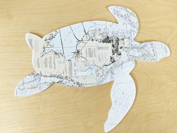 14" x 11.5" Sea Turtle with Bahama region navigation chart covered with a translucent ocean pour. Contact us for more information about wholesale.
