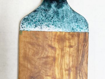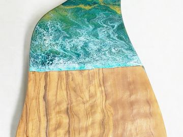 Art resin cutting boards are safe for food contact. Back is left natural for cutting while the decorative resin side is perfect for serving. Comes with a bamboo utencil.